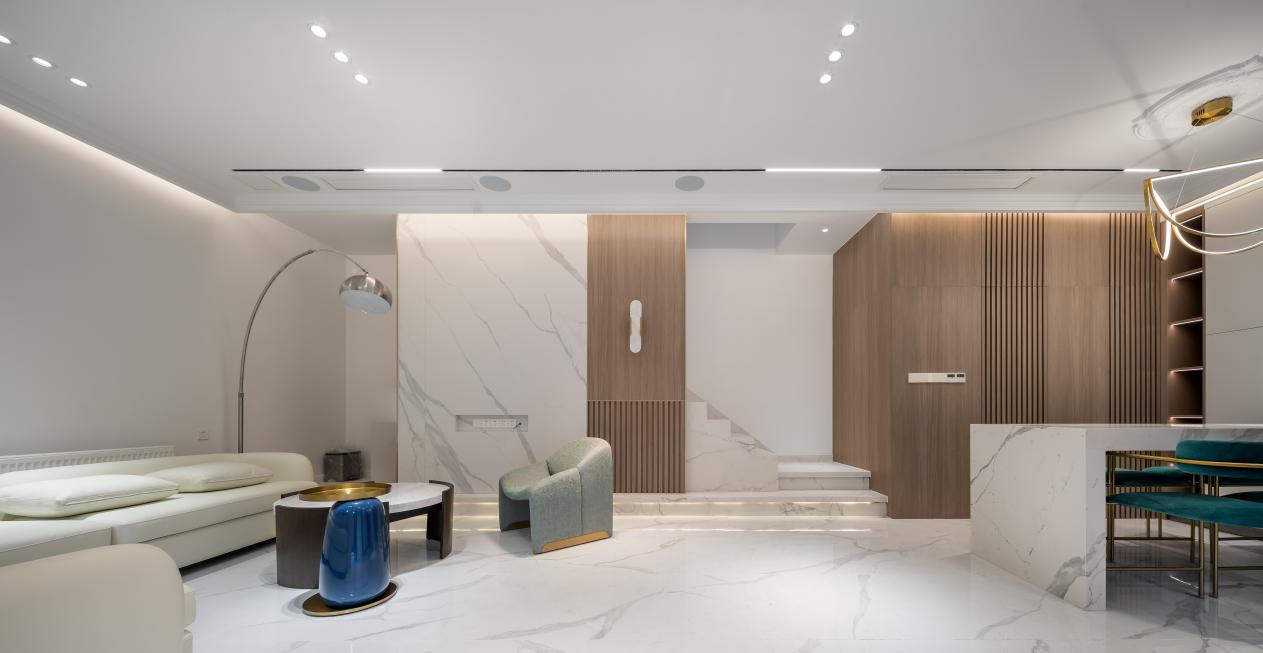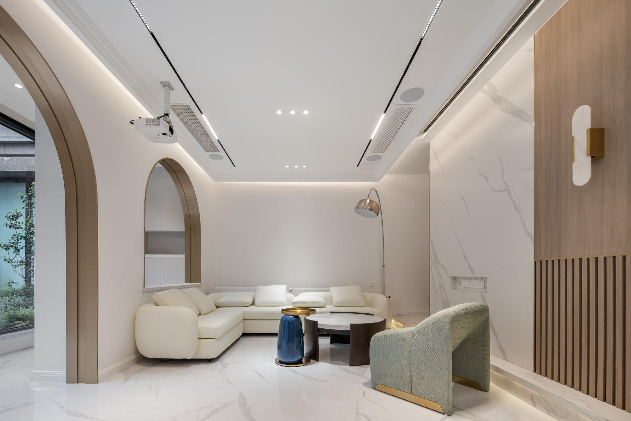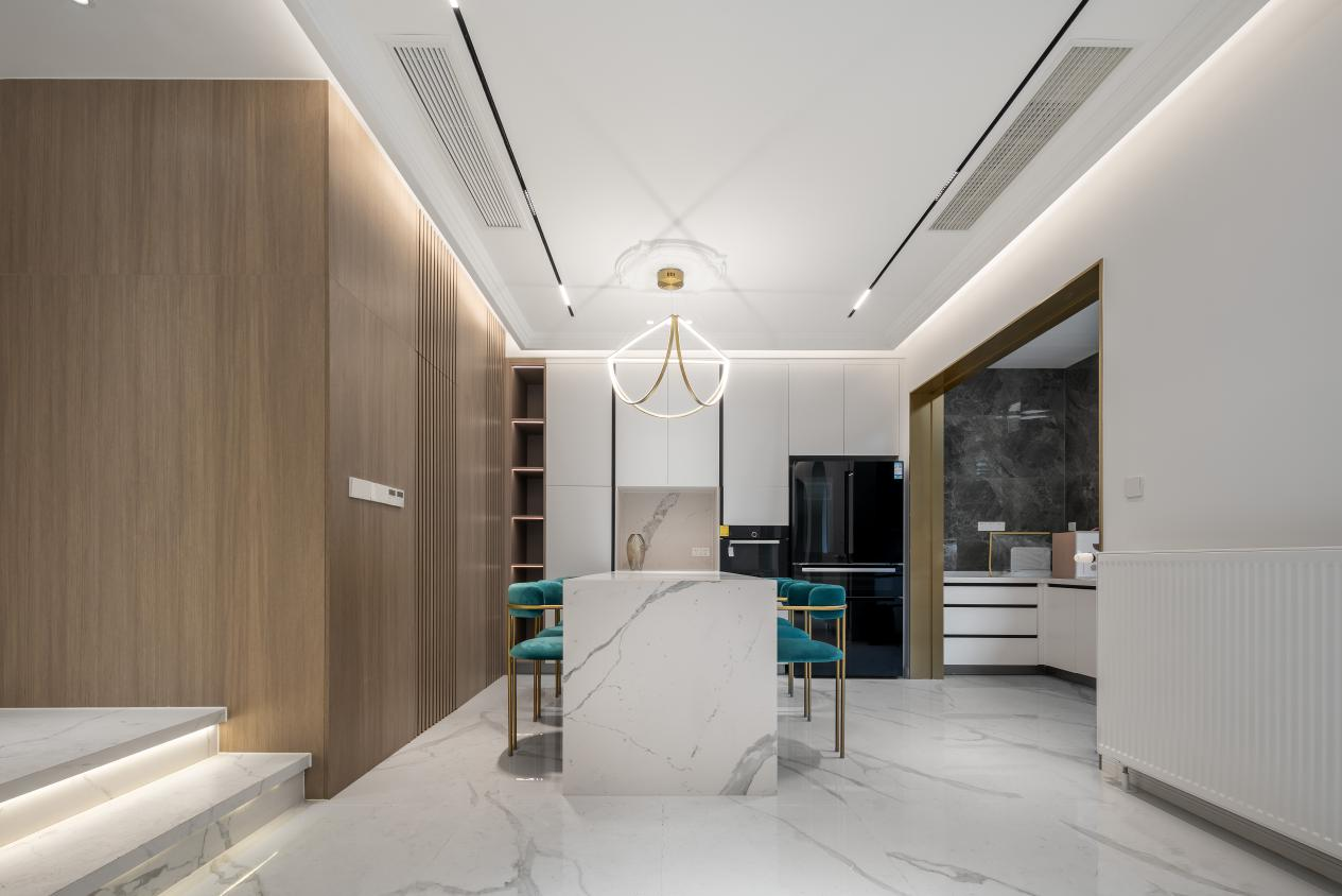 作为一套160㎡套四跃层的户型,张先生一家人常住于此。因此,他对新房装修的需求是:功能性与美观性兼具、个性化与智能化共存。设计师通过前期对房屋的考量与规划,最终确定以当下流行的“轻法式”设计概念为底,融合现代化的建材与智能化的家具,打造出这套混搭风格的新家。