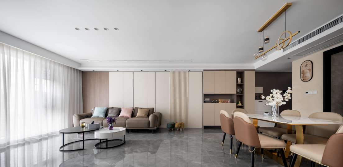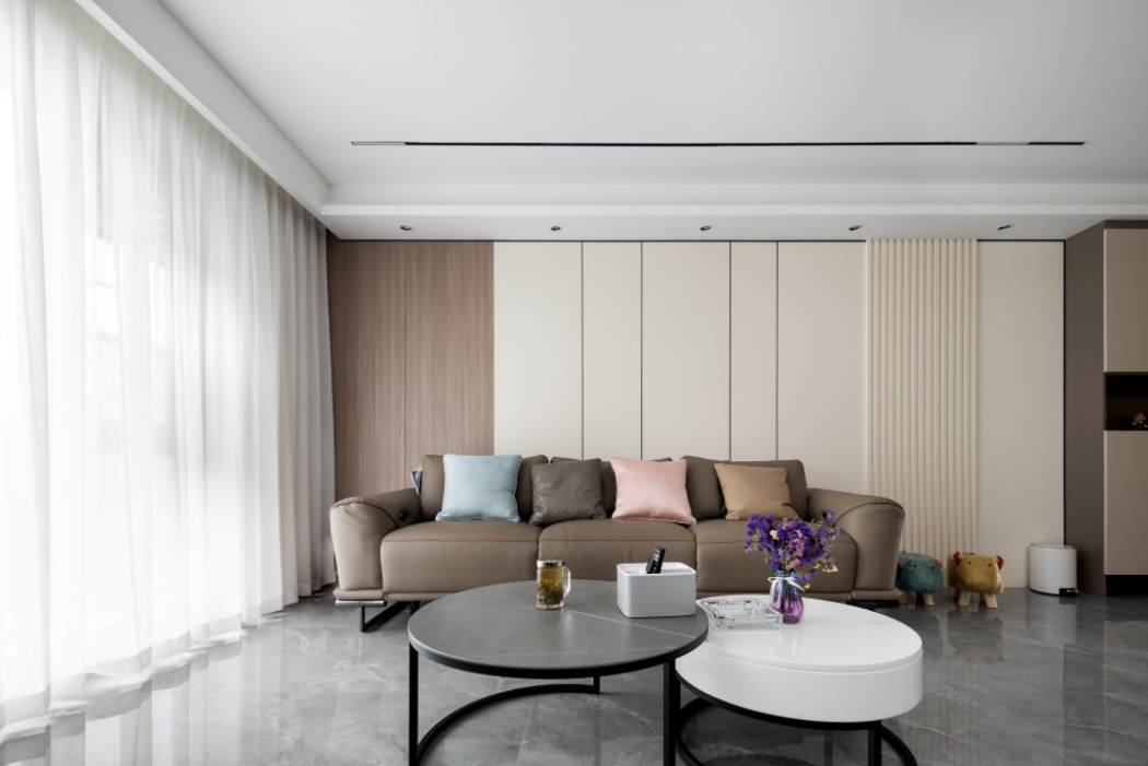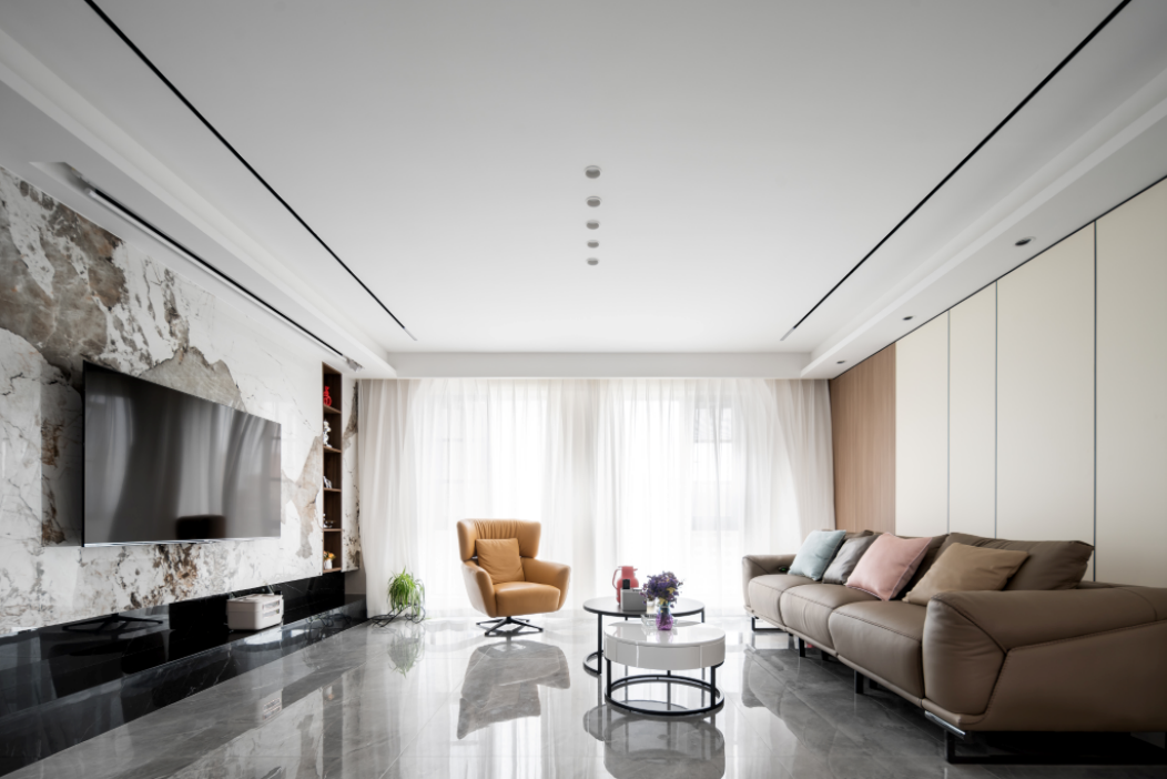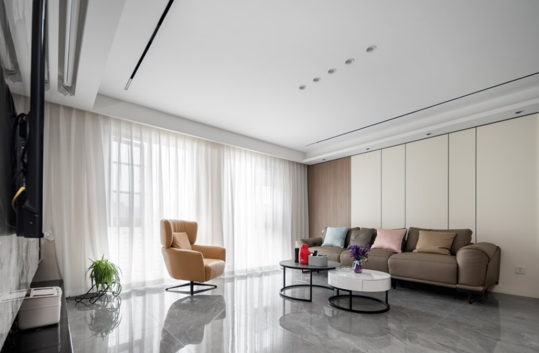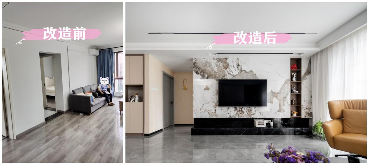 设计师以现代风格打底,地板改为大规格的灰色亮面瓷砖,原沙发位置改为电视墙,潘多拉纹理瞬间提升质感。杂物间与父母房之间空出过道位置,空间不显拥挤同时私密性好。