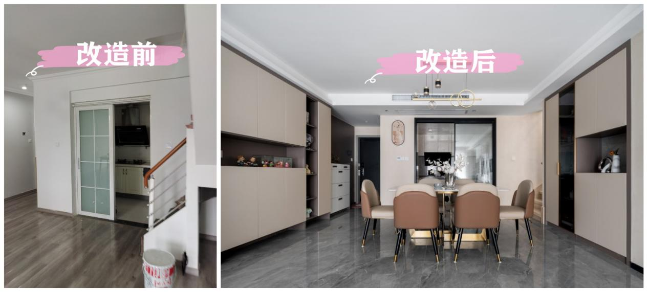 原户型楼梯位置占据空间大,不仅遮挡了厨房和餐厅空间,且入户就看见楼梯影响美观和采光。设计师将楼梯位置后移,空出餐厅空间,增加客餐厅面积,原楼梯下方的空间改造为杂物间,提升空间利用率。业主说这也是很多人都夸改的好的地方,因为这样改造后住起来真的很便利。