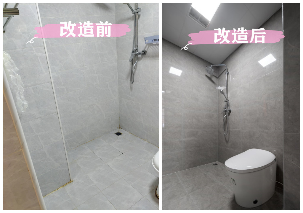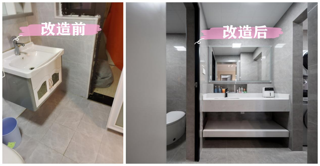 原房屋卫生间十分狭小,盥洗与如厕、淋浴都在同一空间,更显臃肿。阳台不仅没有好好利用,更是直接成为杂物堆放处。设计师将生活阳台并入室内,摆放洗衣机,整体空间呈三分离式布局,平时老人和小孩一起生活也不打挤。